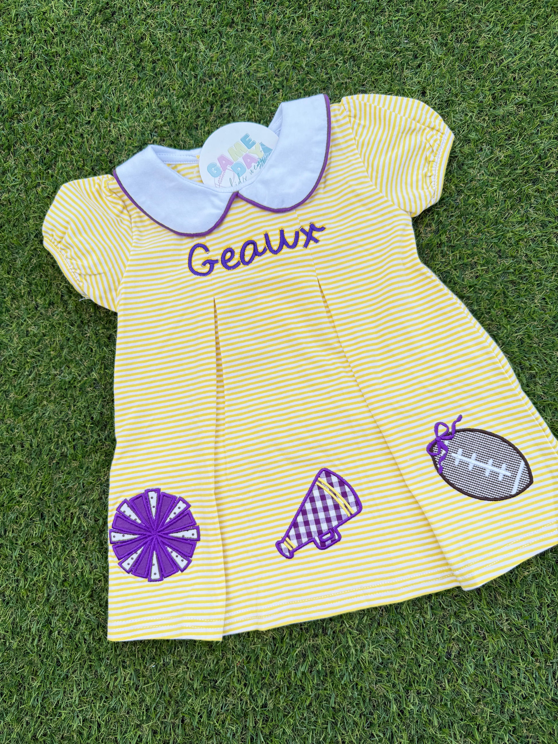 Showcase your little one's pride with this delightful purple and gold applique dress. Embellished with spirited football and cheerleading designs, it's a perfect blend of style and spirit for any young fan.