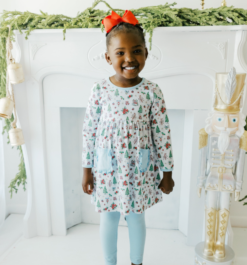 Celebrate the holidays with the Christmas Tidings Collection! This adorable print is sure to have your girl in the Christmas spirit! Matching sister options available. 95% Cotton 5% Spandex. Fits true to size.